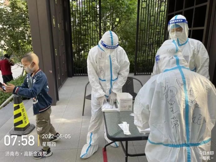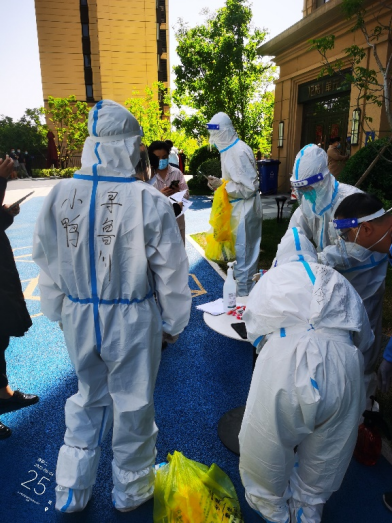 由于一直在高溫下“全副武裝”,志愿者的防護(hù)服早已被汗水浸濕,手掌被泡得發(fā)白,臉上也被口罩勒出了痕跡,更有志愿者出現(xiàn)了頭暈、流鼻血等中暑癥狀。盡管如此,他們也是稍加休整,便再次沖鋒向前。休息時間,志愿者們席地而坐,匆匆吃完奔赴崗位,因忙碌而錯過飯點更是常事,然而他們卻從未有過怨言;腰肌勞損、椎間盤不好的團(tuán)隊干部即使腰疼的直不起來,也依舊抵擋不住他助力抗疫的熱情與行動?!▲喼驹刚邔敶ㄔ趨f(xié)助核酸檢測時,有一個小男孩很不配合,由于當(dāng)天的核酸檢測并沒有貼紙,男孩媽媽便偷偷準(zhǔn)備了小貼畫,拜托尋魯川給小朋友貼上。尋魯川很感動,并且樂意幫忙,尋魯川說:“他兩只大眼睛直勾勾的盯著貼紙看,特別萌,心都被萌化了,真是開心了一整天,所有的疲憊都一掃而空?!?nbsp;…… 在抗“疫”前線,小鴨人和社區(qū)居民們互相理解,互相配合,如此令人感動又暖心的事跡不勝枚舉。
